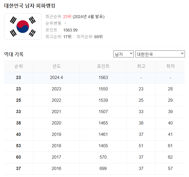 대한민국의 FIFA랭킹은 23위입니다. 이에 비해 중국의 FIFA랭킹은 88위로 상대적으로 매우 낮은 순위를 유지하고 있습니다.